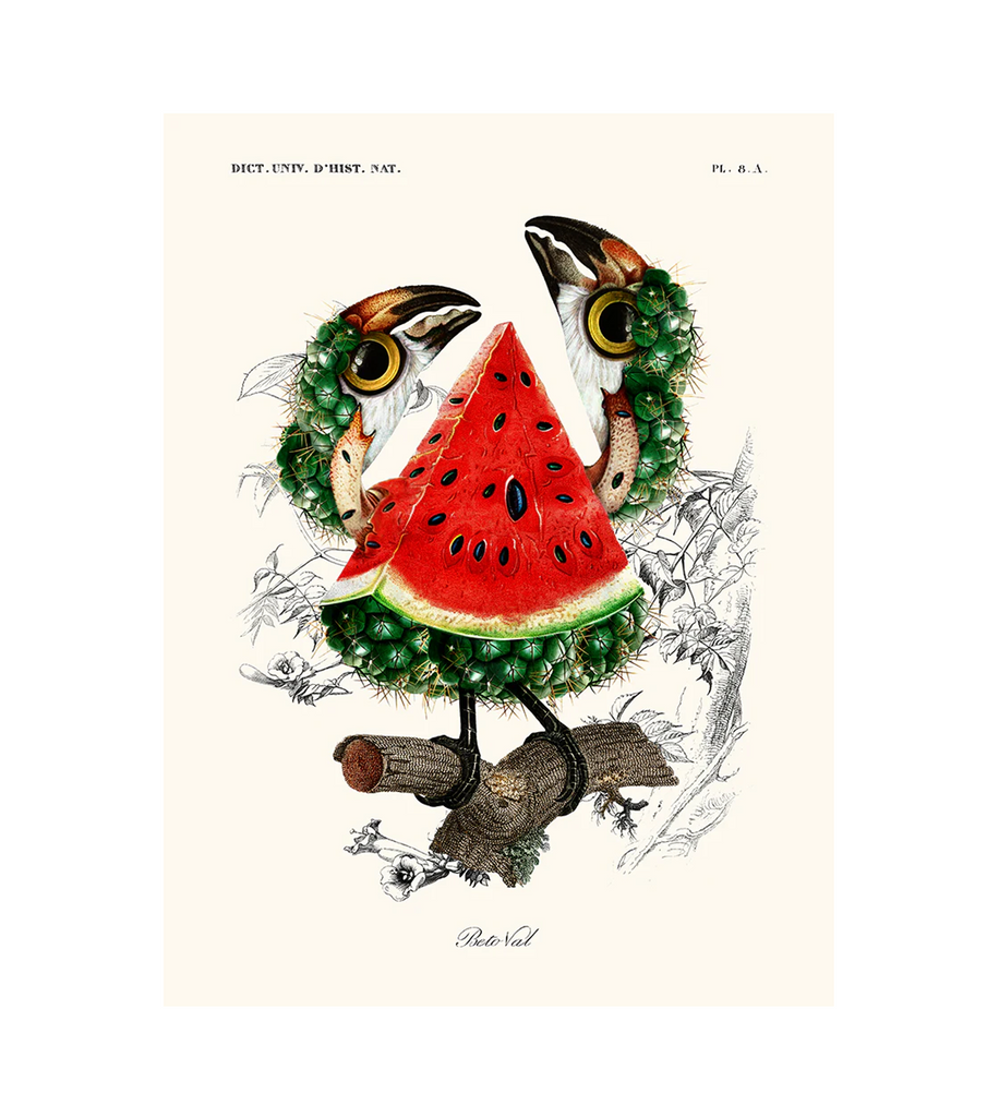 Affiche Béto Val, Watever Melon. Artiste équatorien, Béto Valencia, plus connu sous le nom de Béto Val, utilise le collage numérique pour nous plonger dans un monde surréaliste composé d'êtres absurdes et excentriques